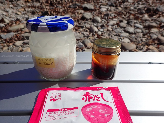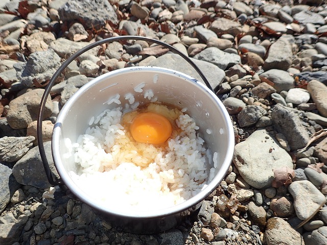 卵かけご飯を堪能した後のクッカーに味噌汁の元と湯を入れて食せば、洗う手間が多少、少なくできる。