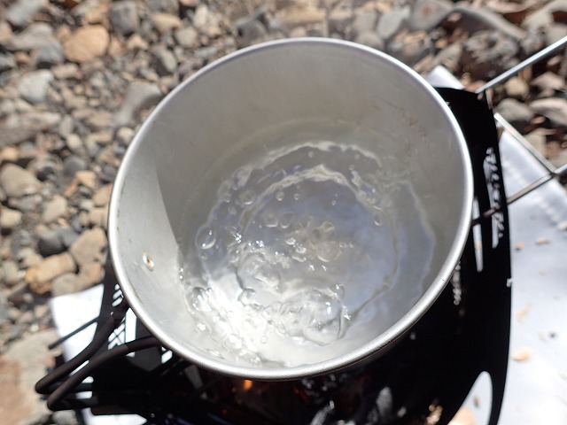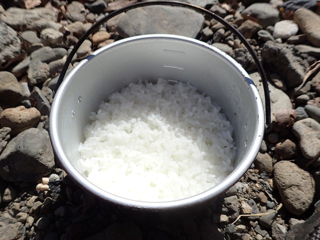 吹きこぼれもなんのその、焦げ付くこともなく炊けてしまった。すぐさまアルミポットを火から降ろし、もう一つのポットに水を入れ、火に掛ける。ご飯を蒸らしている間に湯を沸かすのだ。