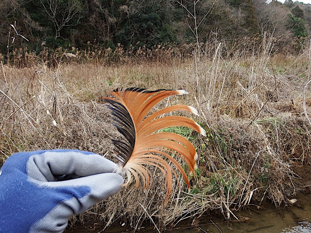 今回、オシドリの本体はなく、残されたのはむしられた羽根のみ。
